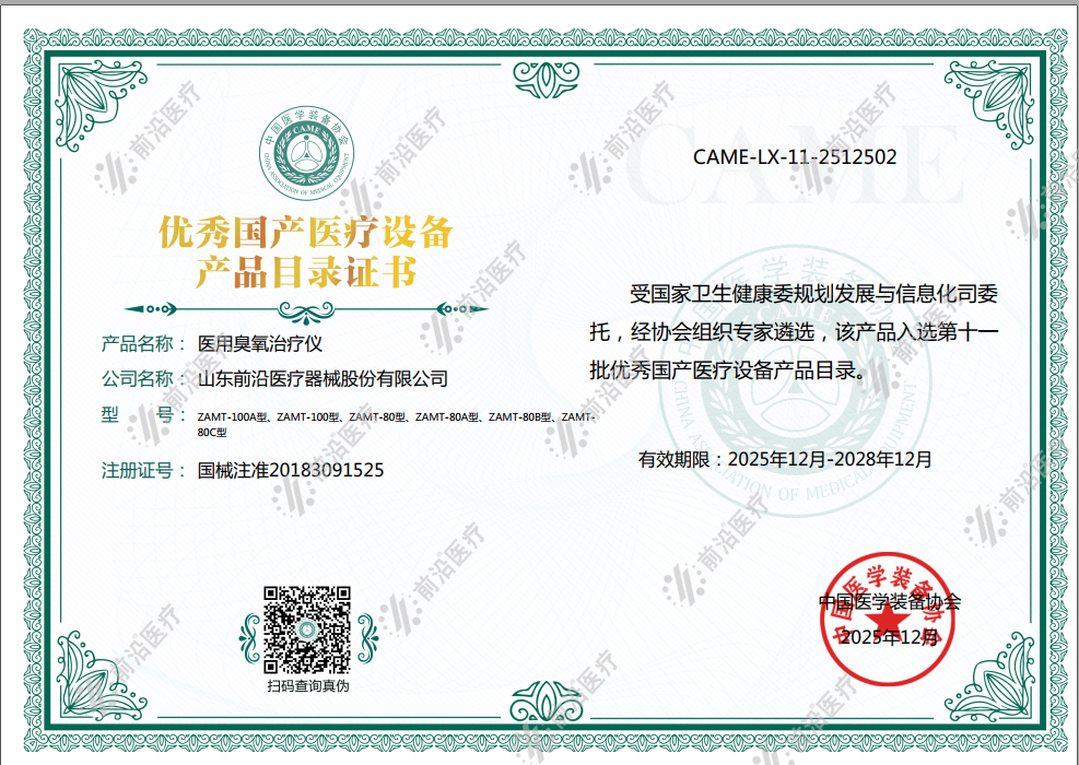 祝賀前沿醫(yī)療6款醫(yī)用臭氧治療儀,成功入選中國醫(yī)學裝備協(xié)會評選的第十一批優(yōu)秀國產(chǎn)醫(yī)療設(shè)備名單!這是繼2020年11月,公司研發(fā)生產(chǎn)的內(nèi)熱式針灸治療儀入選《第九批優(yōu)...